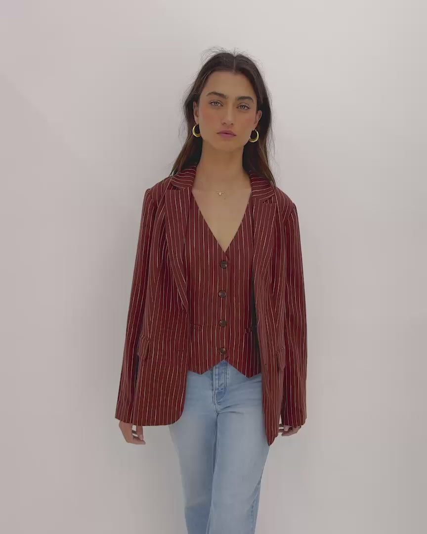 Proof that vests are having a moment. This linen-blend beauty combines classic tailoring with effortless charm, featuring a sharp V-neck, button front, and two welt pockets for a polished finish. The back elastic adds a touch of stretch for the perfect fit, while the subtle pinstripes keep it cool and versatile. Layer it up or wear it solo—either way, it’s a total vibe.