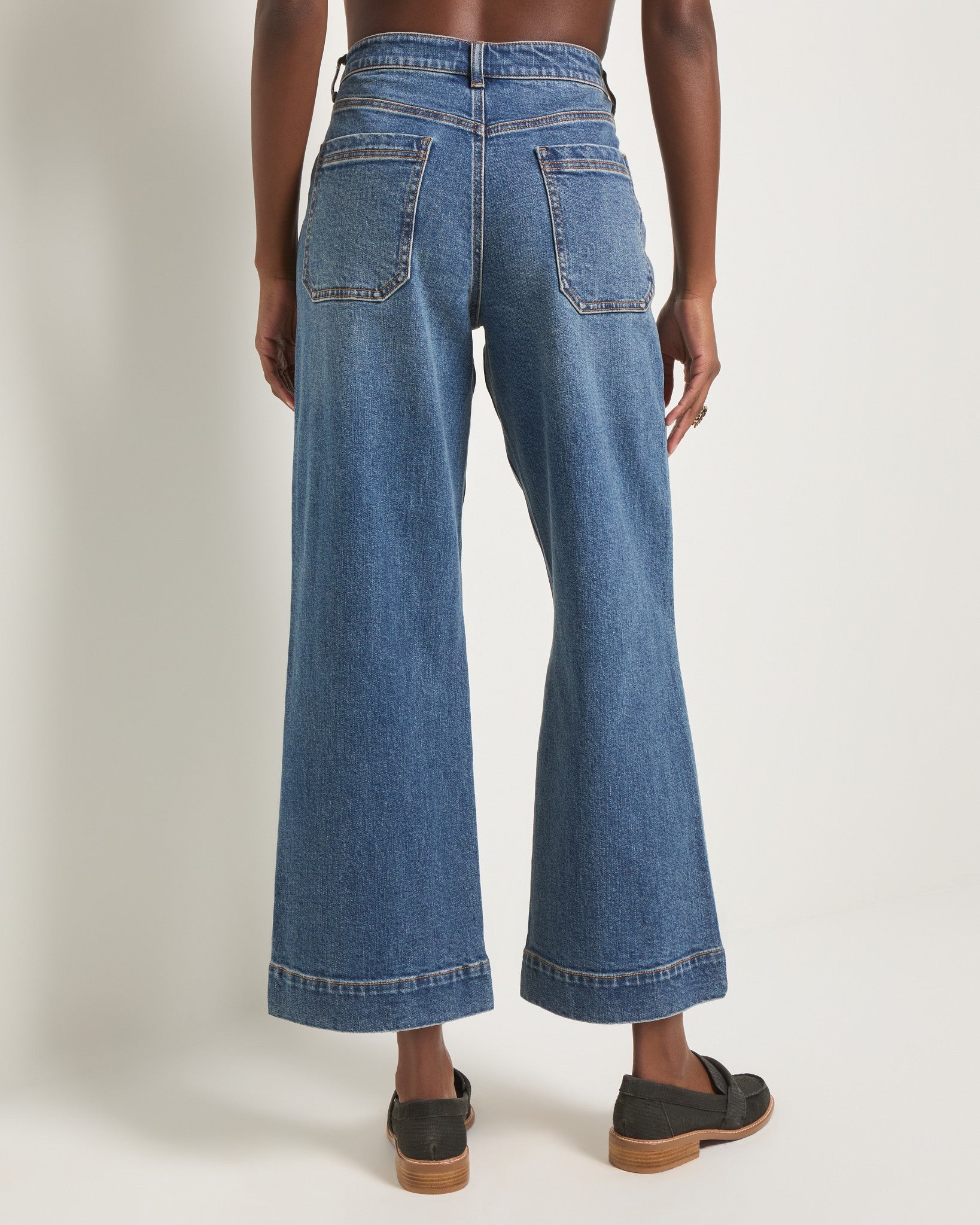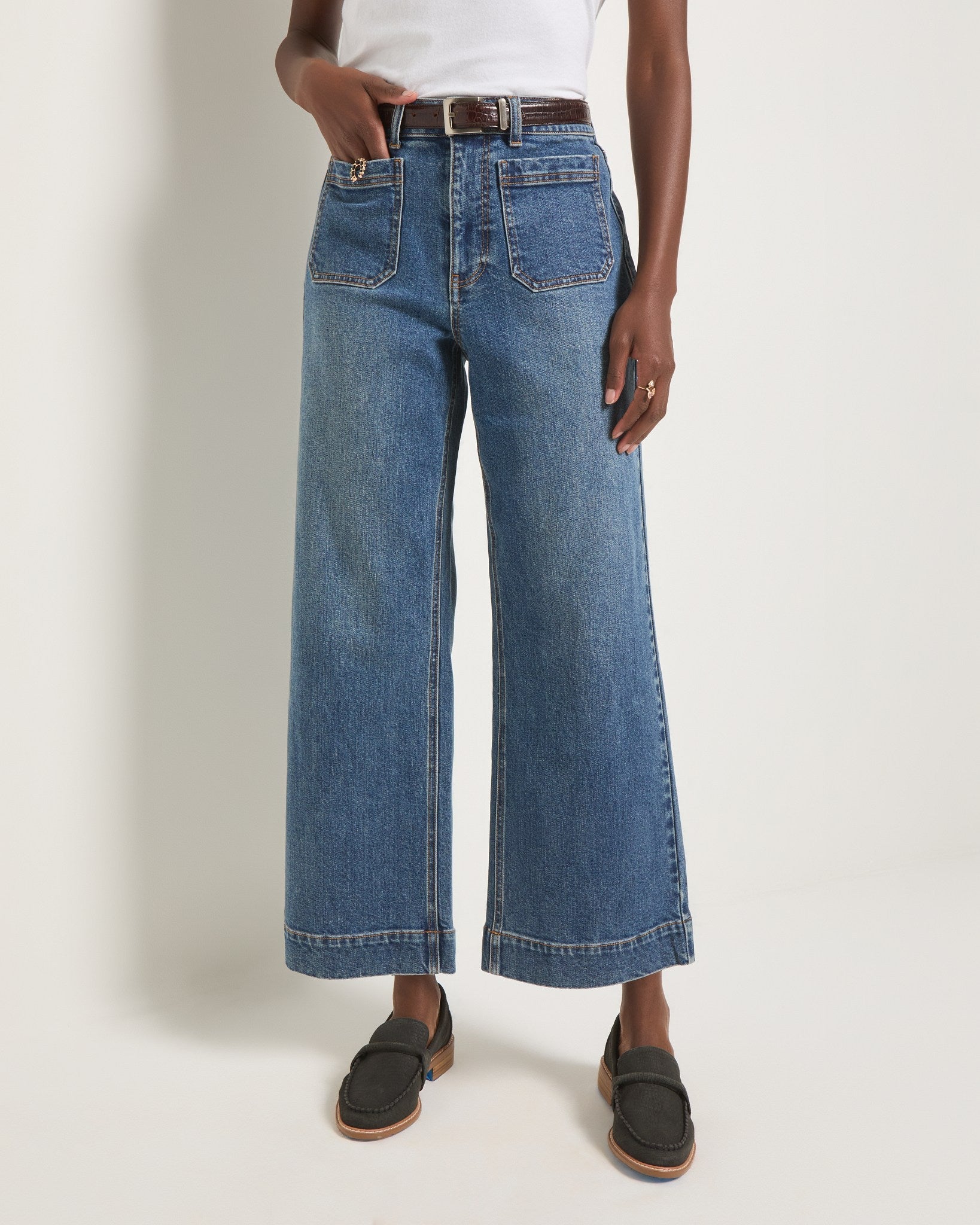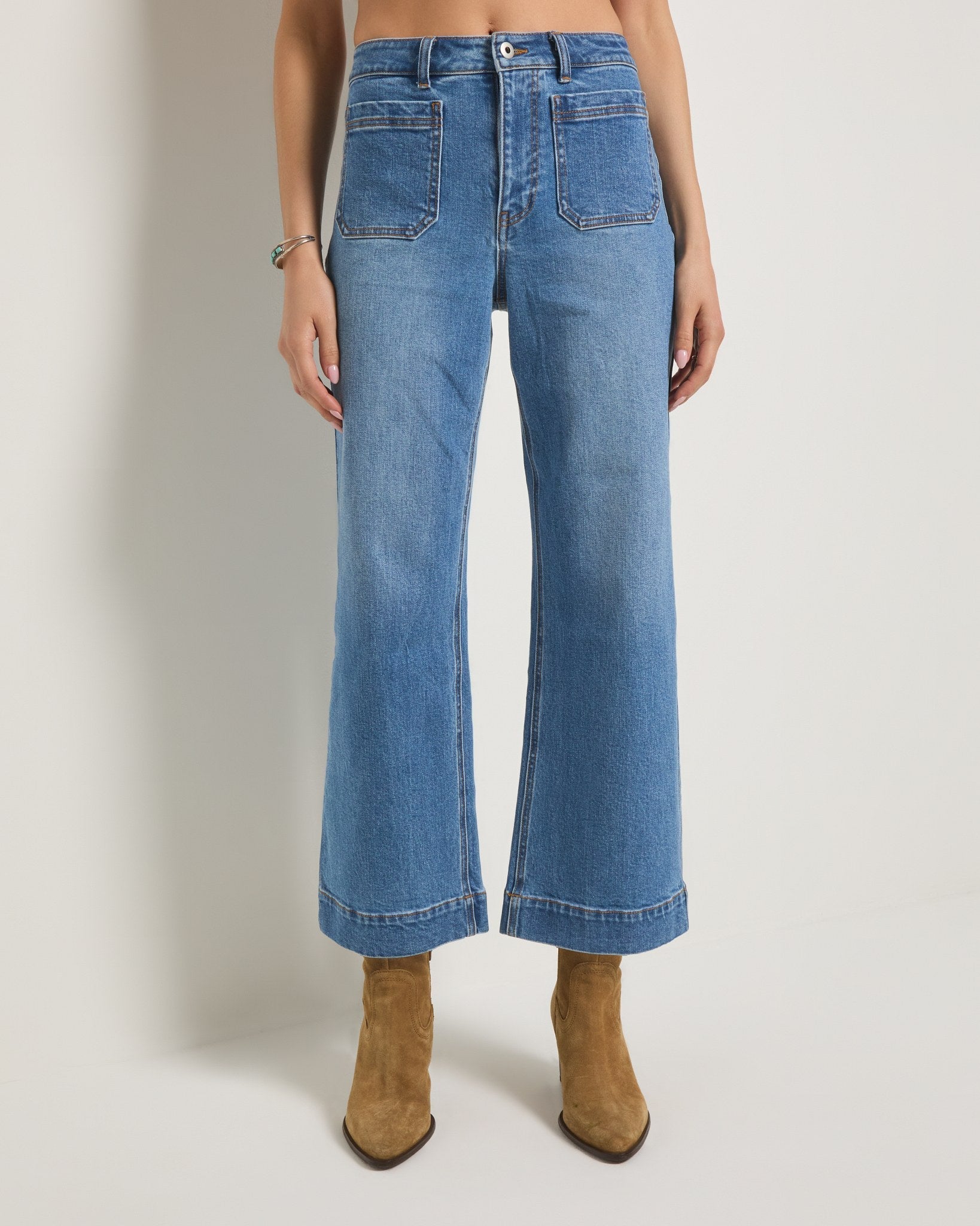 These high-rise, wide-leg jeans are cut from sturdy cotton denim with no stretch and serious shape. Patch pockets add vintage charm. Stylized wide hems bring a little extra kick.