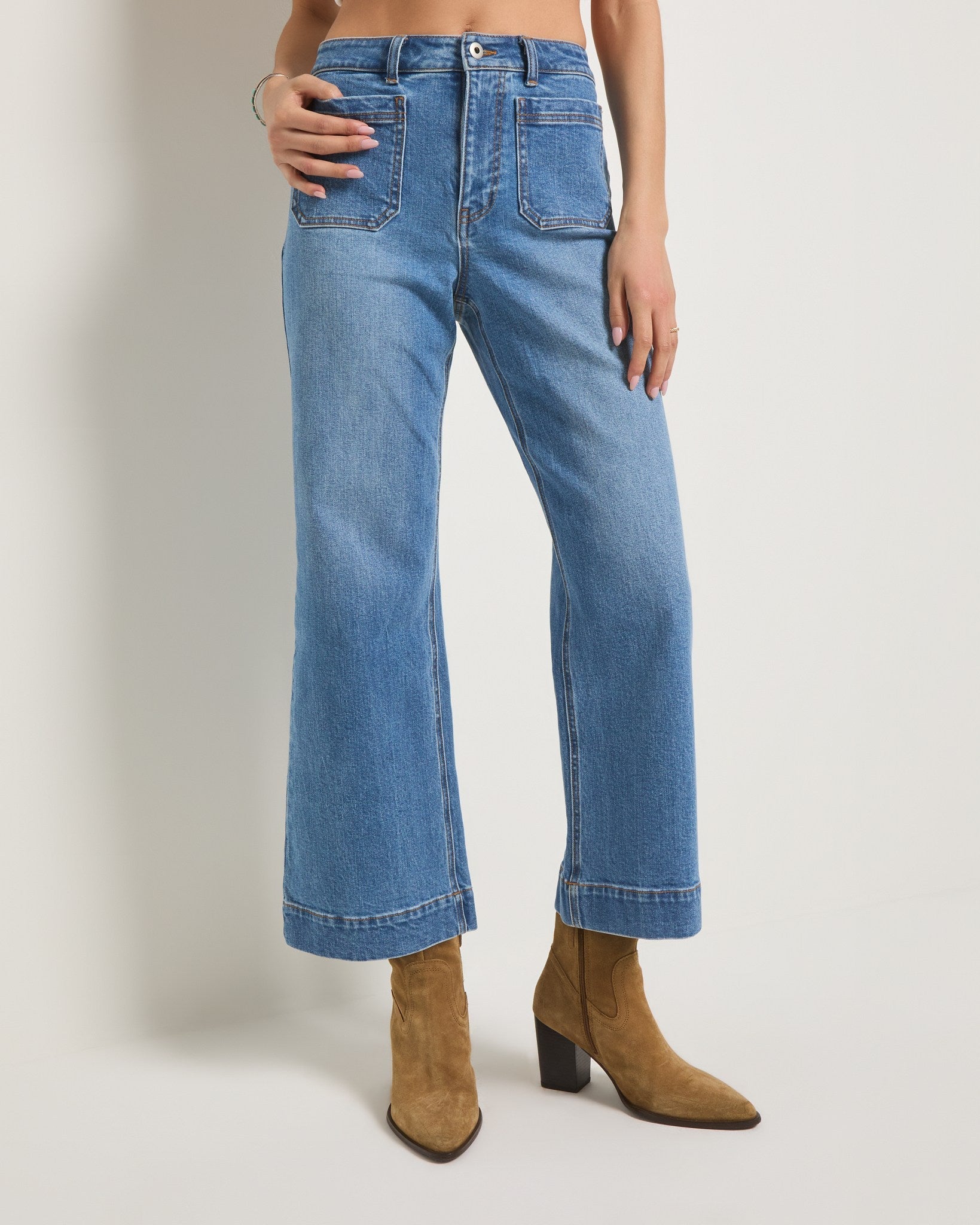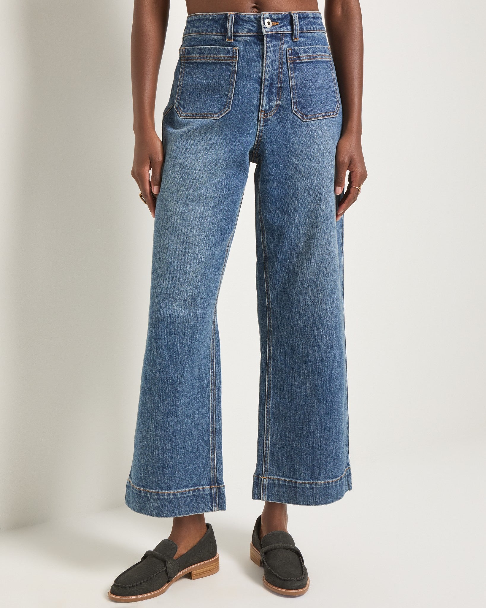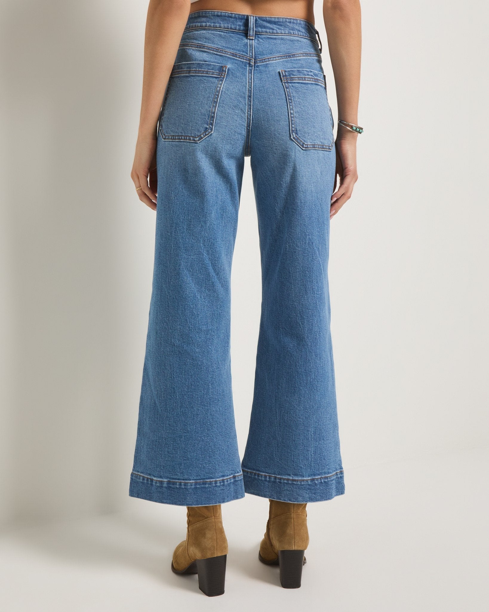 These high-rise, wide-leg jeans are cut from sturdy cotton denim with no stretch and serious shape. Patch pockets add vintage charm. Stylized wide hems bring a little extra kick.