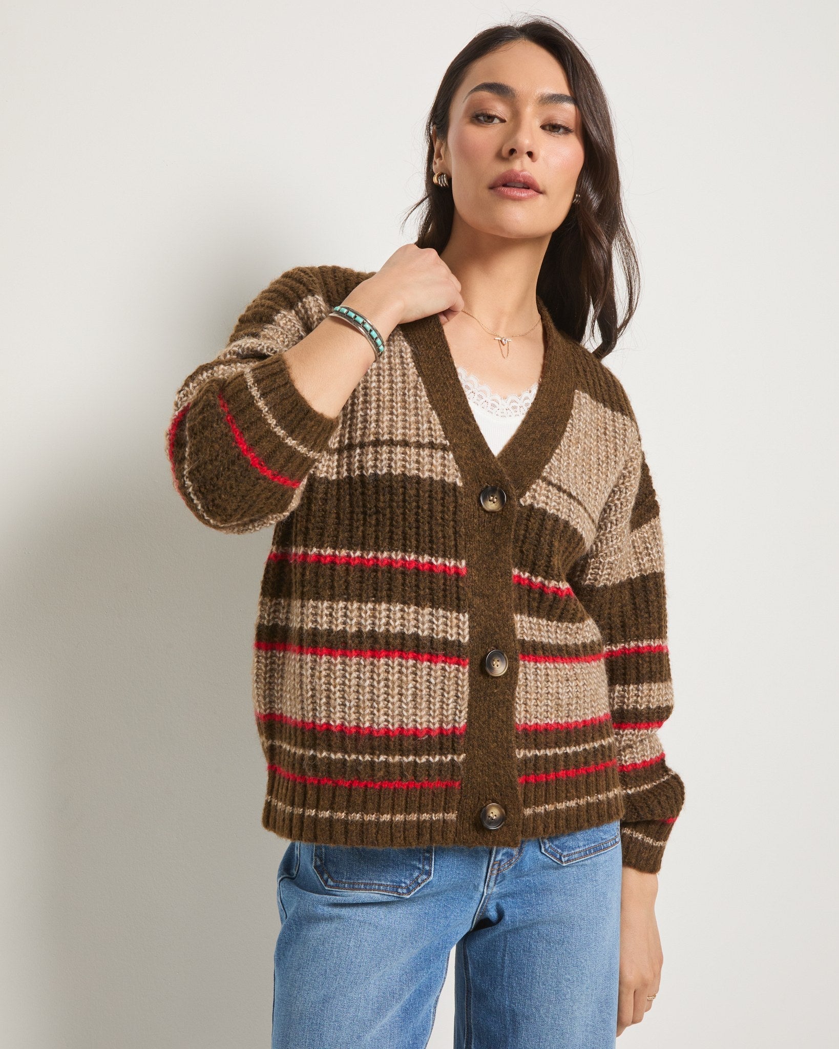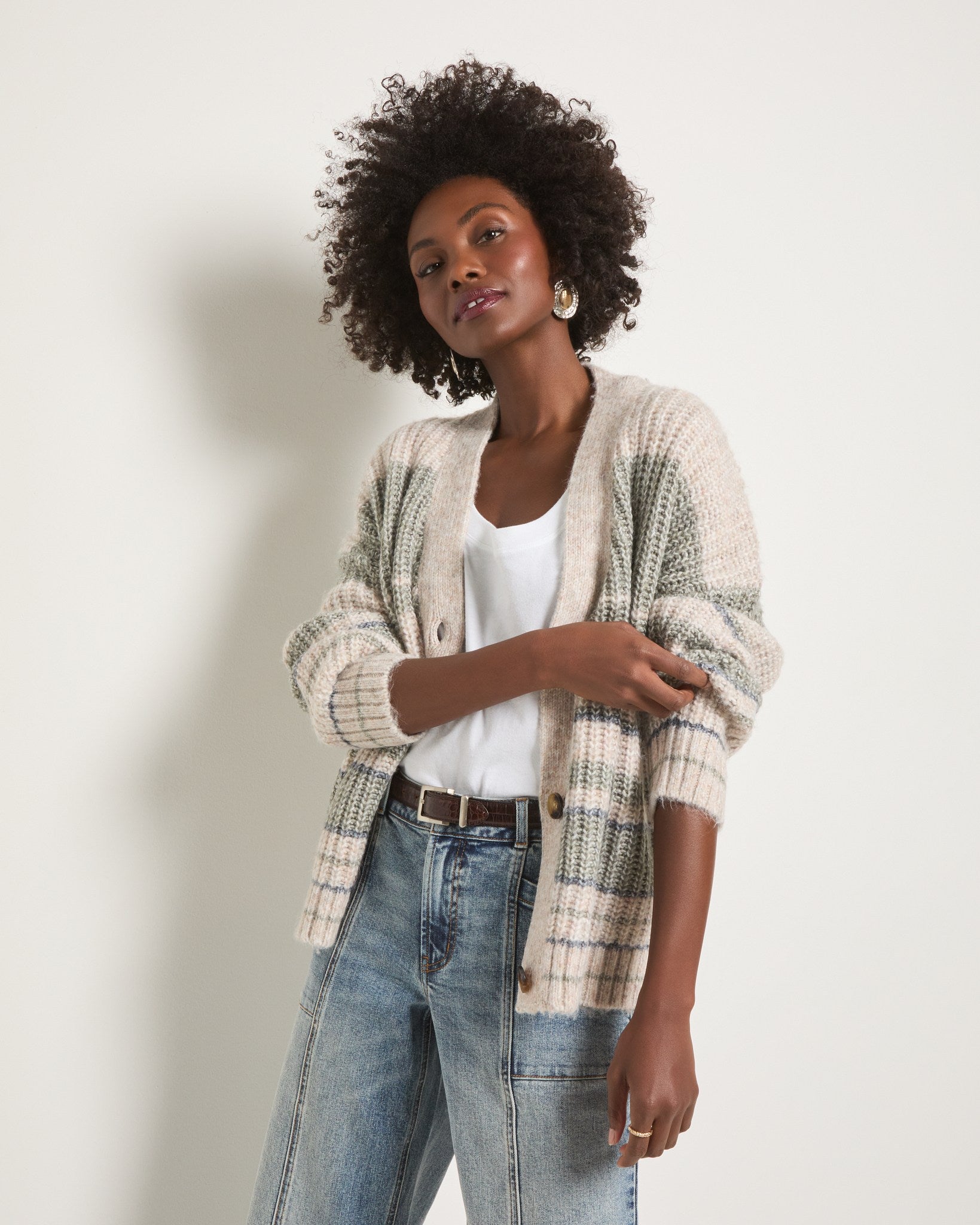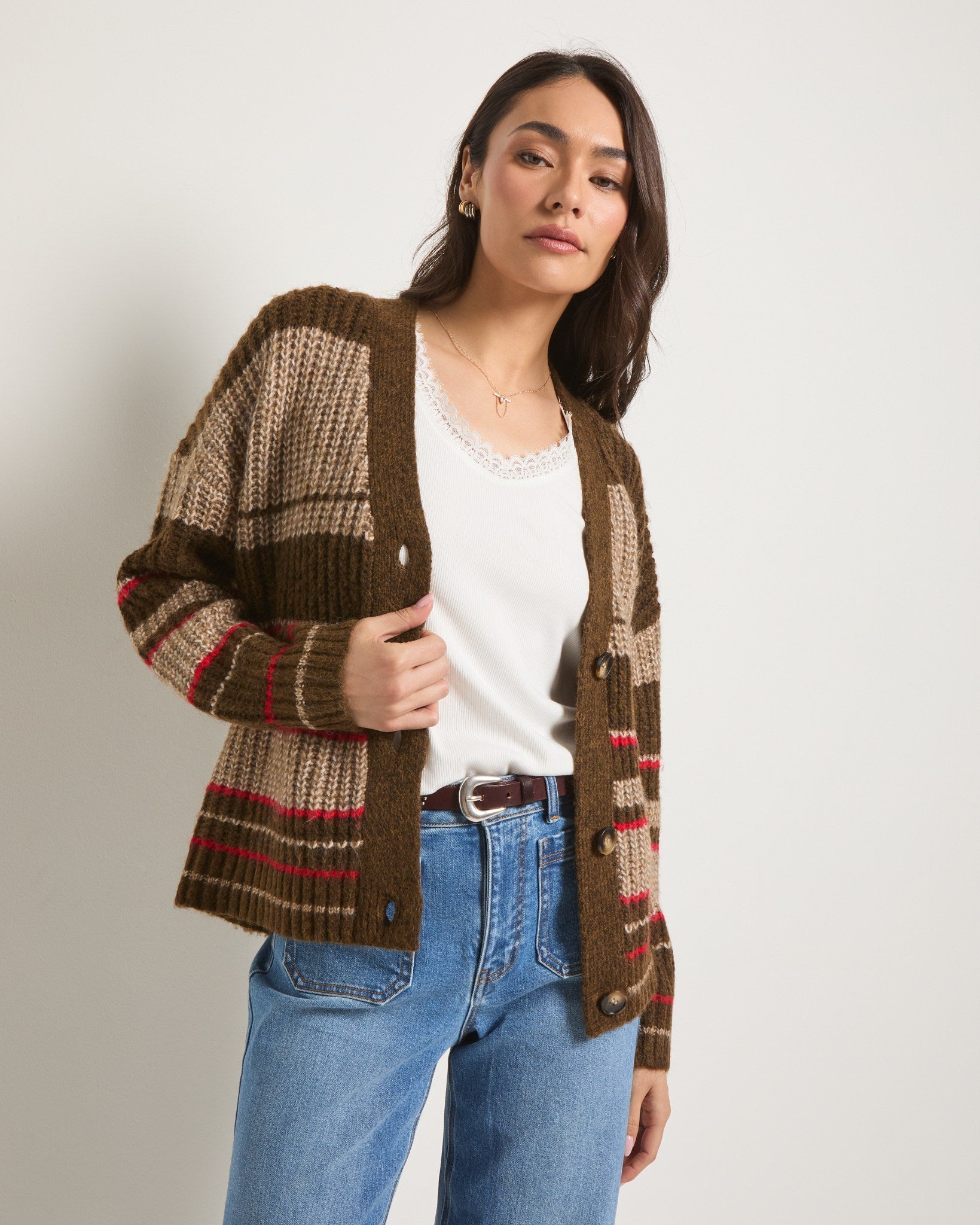 Bold stripes meet a fuzzy eyelash knit for a little bit of drama in your layering game. Button front, easy fit, and a texture that’s basically an invitation to get closer.