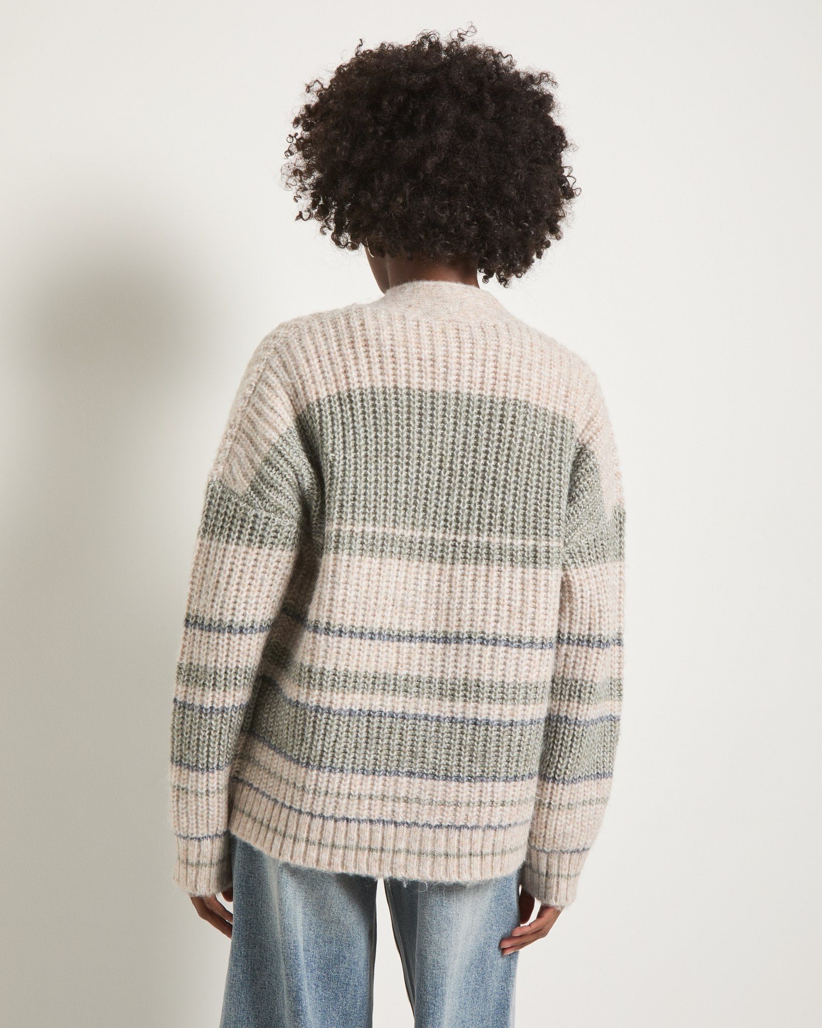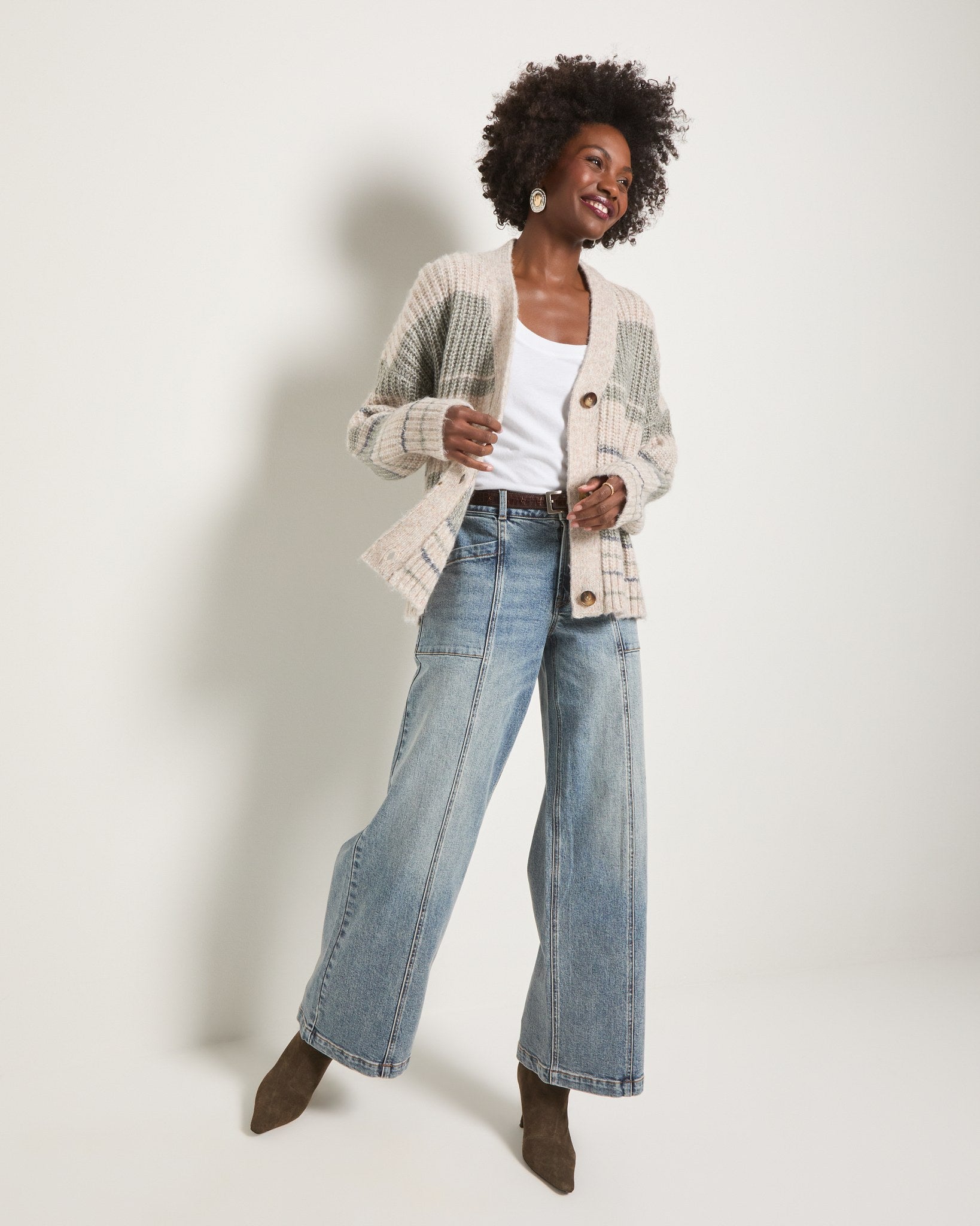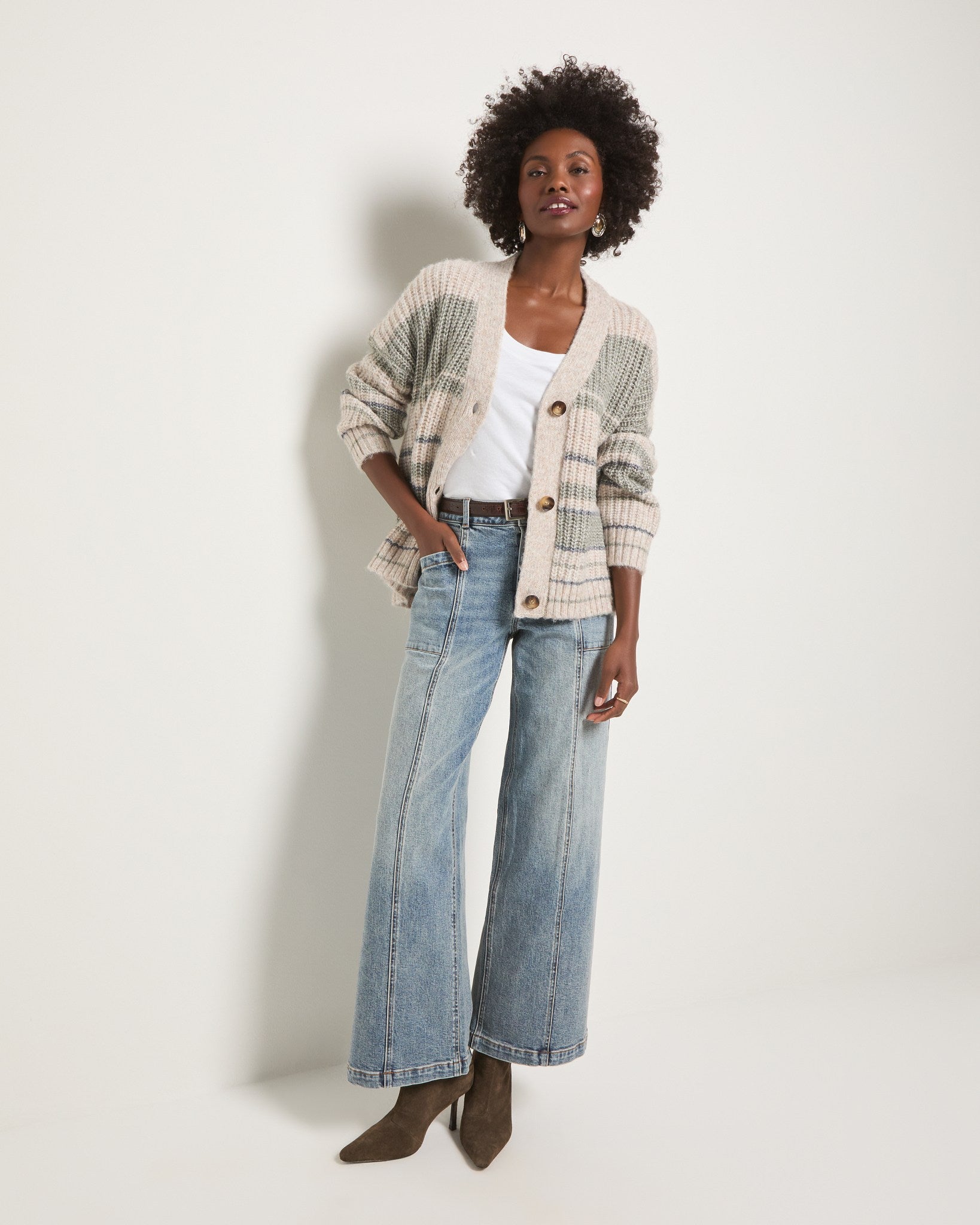 Bold stripes meet a fuzzy eyelash knit for a little bit of drama in your layering game. Button front, easy fit, and a texture that’s basically an invitation to get closer.
