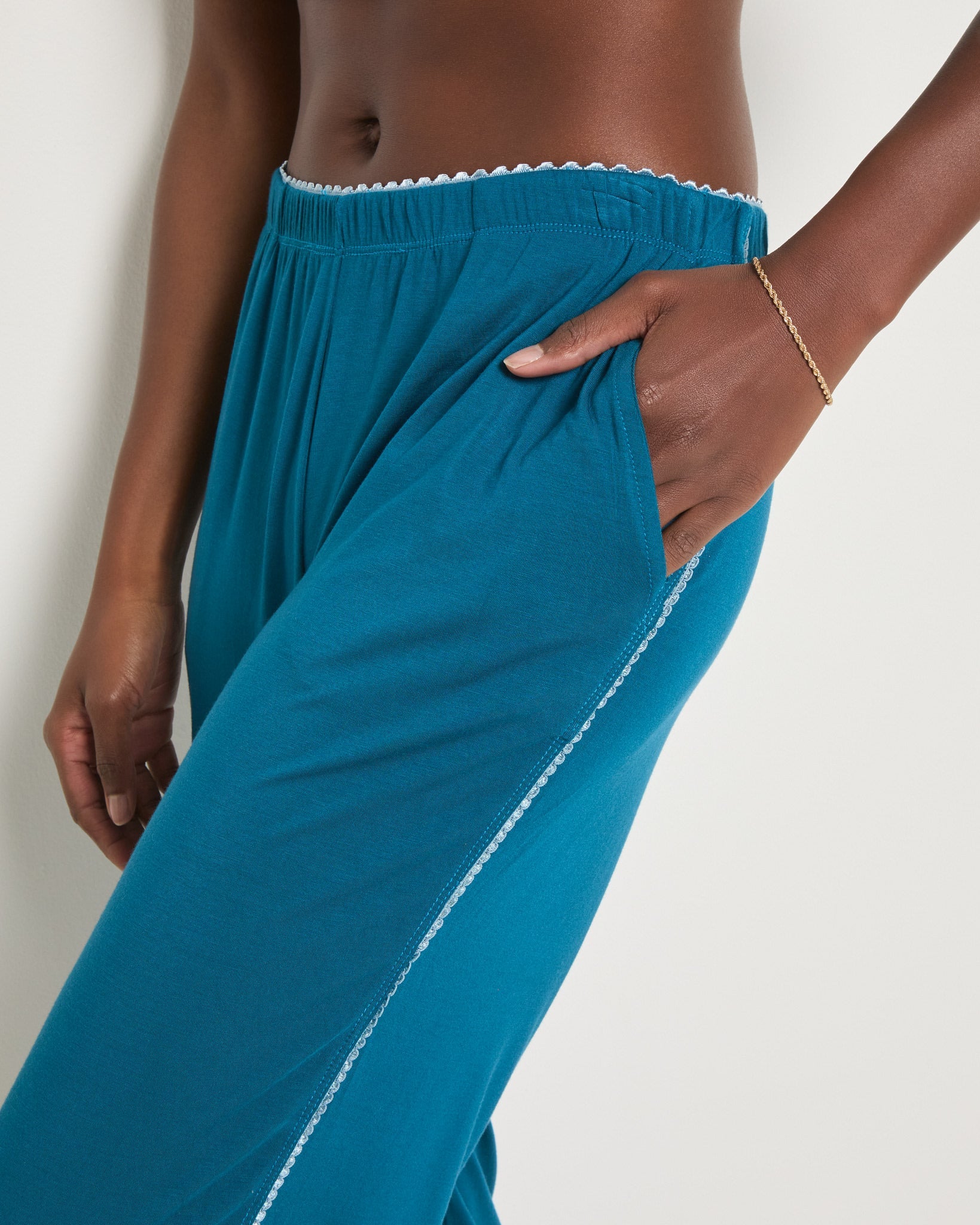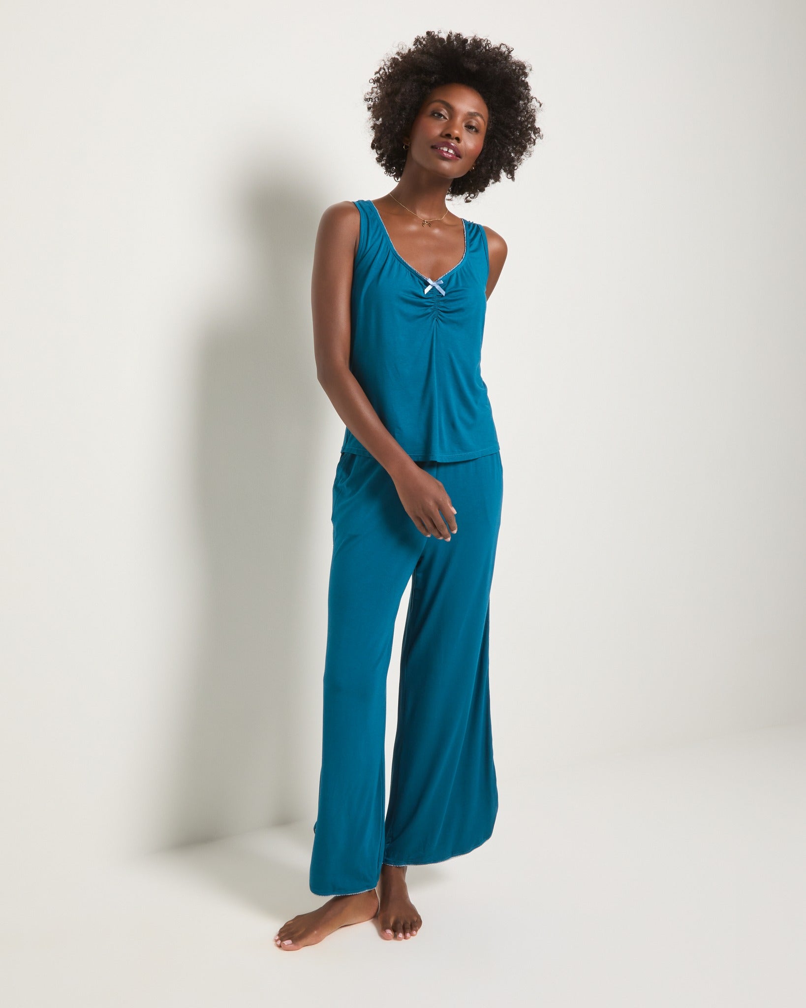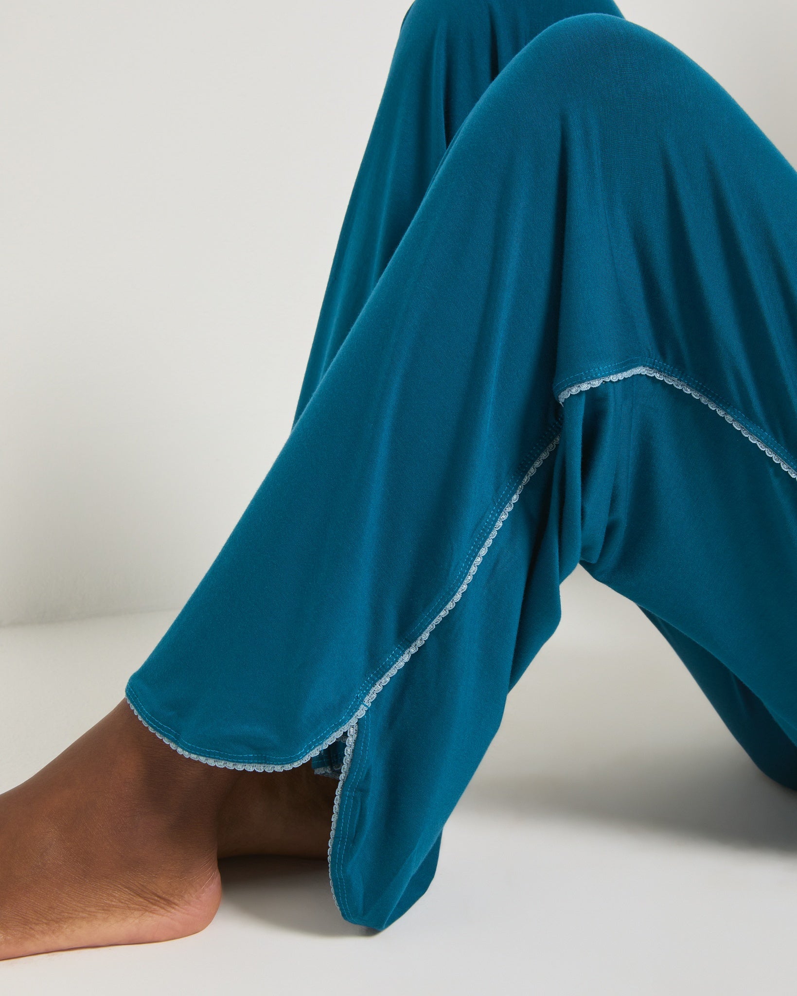 Scalloped lace, a touch of ruching, and tulip hems that sway with every step. Whether you’re drifting from room to room or city to city, this lounge set travels well.