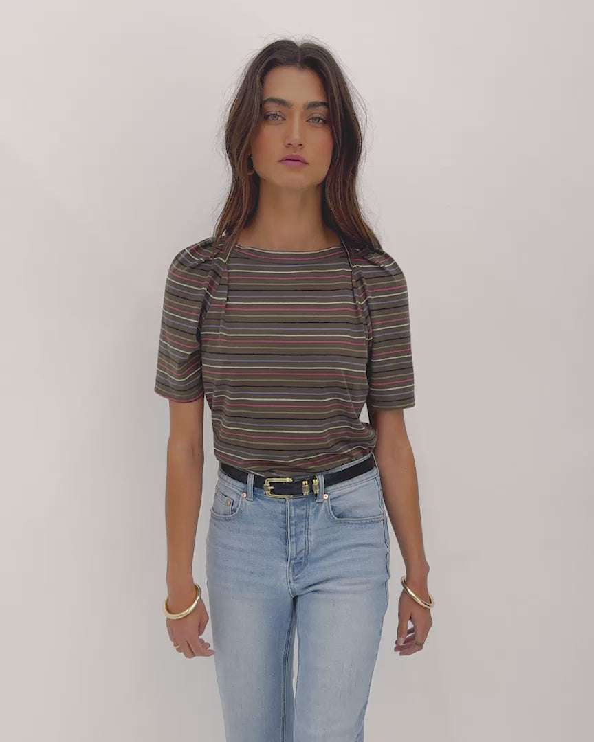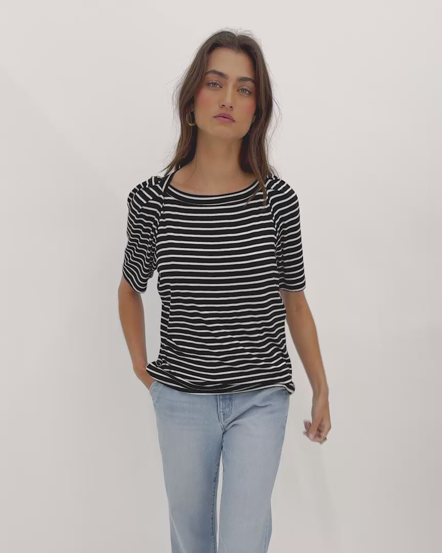 This isn’t your average tee. With a classic boat neck, relaxed fit, and playful puff sleeves, it strikes the perfect balance between polished and laid-back. Made from breathable 100% cotton knit for all-day ease—consider it the cherry on top.